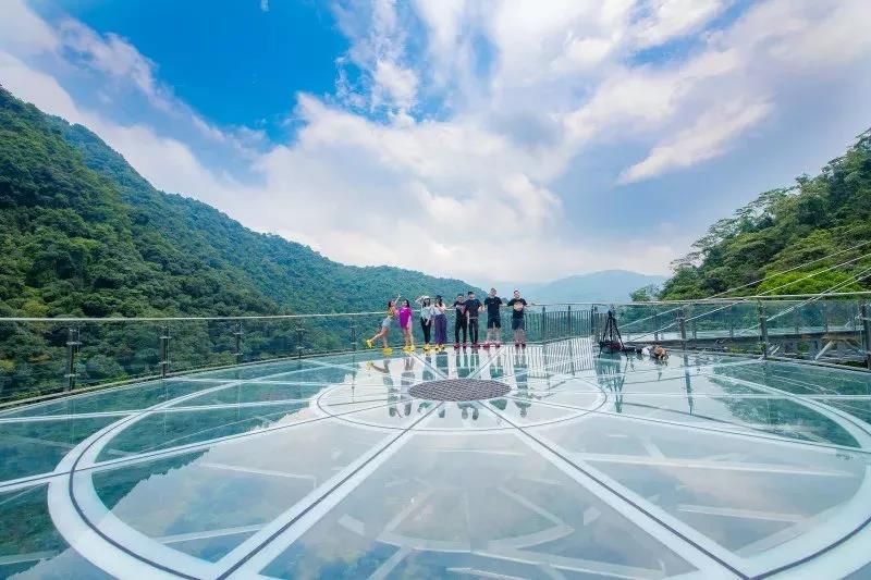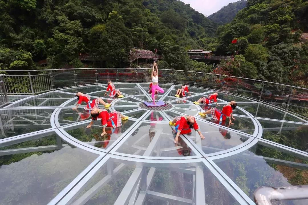懸空玻璃平臺全長202米,以72米的懸空跨度名列世界第一,為美國科羅拉多大峽谷的U形橋(21米)的3.5倍;點(diǎn)睛之筆是平臺頂部直徑16.8米的玻璃觀景圓臺,這是和瀑布親密接觸的絕佳位置。圓臺中間獨(dú)具匠心地設(shè)計(jì)了網(wǎng)格狀鏤空,山風(fēng)穿透,頓生寒意;踏步其上,如墜深淵,令人心驚膽寒。