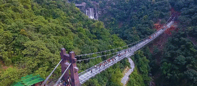 古龍峽玻璃橋全長329米,平均寬度3.8米,最寬處6.8米,橋上2個港灣式透明觀景凸臺位于最寬處,和UFO玻璃平臺遙相呼應(yīng)。作為世界最寬的觀瀑玻璃橋,在國內(nèi)第一家采用超大面積玻璃,橋面可以容納5人并行,也可從容地拍下全身照,面積達(dá)40平方米港灣式觀景凸臺設(shè)置了5D聲光電特效裝置,感應(yīng)到游客經(jīng)過時,會出現(xiàn)“山崩地裂”“玻璃破碎”等奇幻效果。經(jīng)浙江大學(xué)土木工程系測試,玻璃橋靜態(tài)負(fù)載可超過700人。