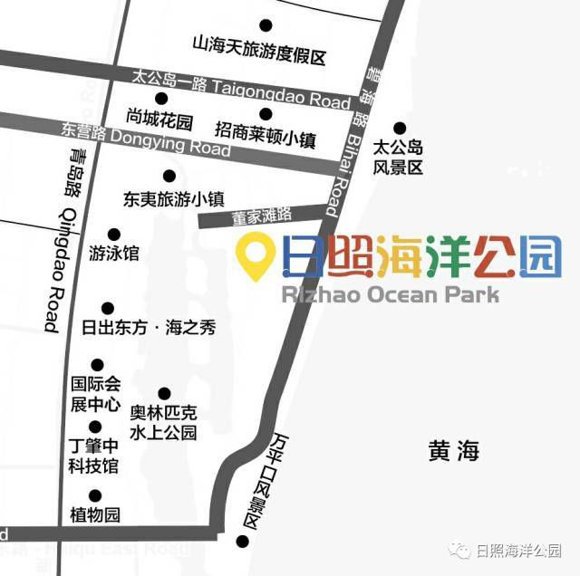 日照高速北出口→山海路→碧海路(南行4公里)→日照海洋公園